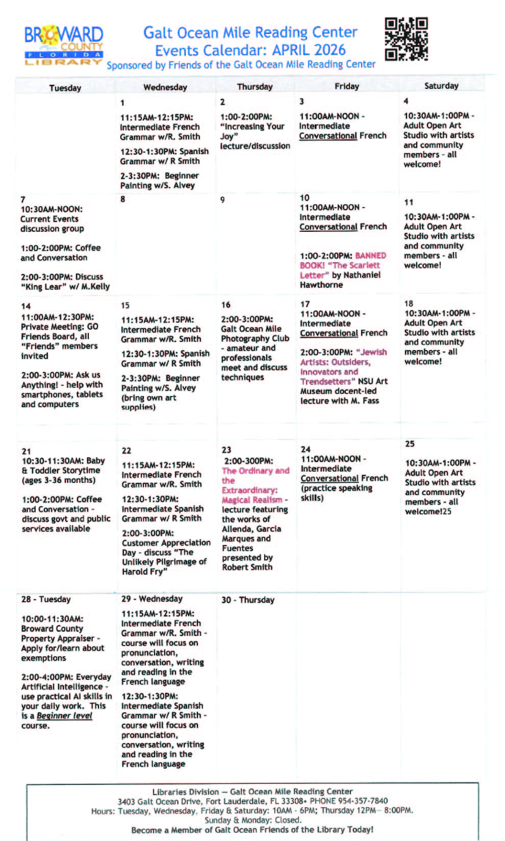 Join us at the Galt Ocean Mile Reading Center for a wonderful month of activities and events. See the calendar and pick all the ones
