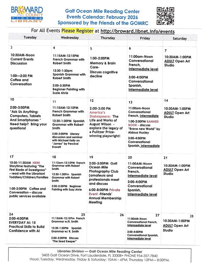 Join us at the Galt Ocean Mile Reading Center for a wonderful month of activities and events. See the calendar and pick all the ones that interest you. Remember – all the events are FREE.