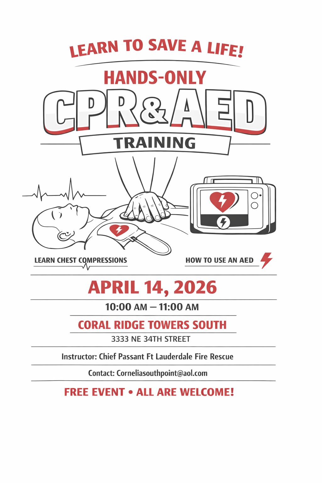 Fort Lauderdale Fire Rescue will provide CPR/AED training for Galt Mile residents and their staffs on April 14 at Coral Ridge Towers South from 10-11 am. The course last one hour and it is FREE.