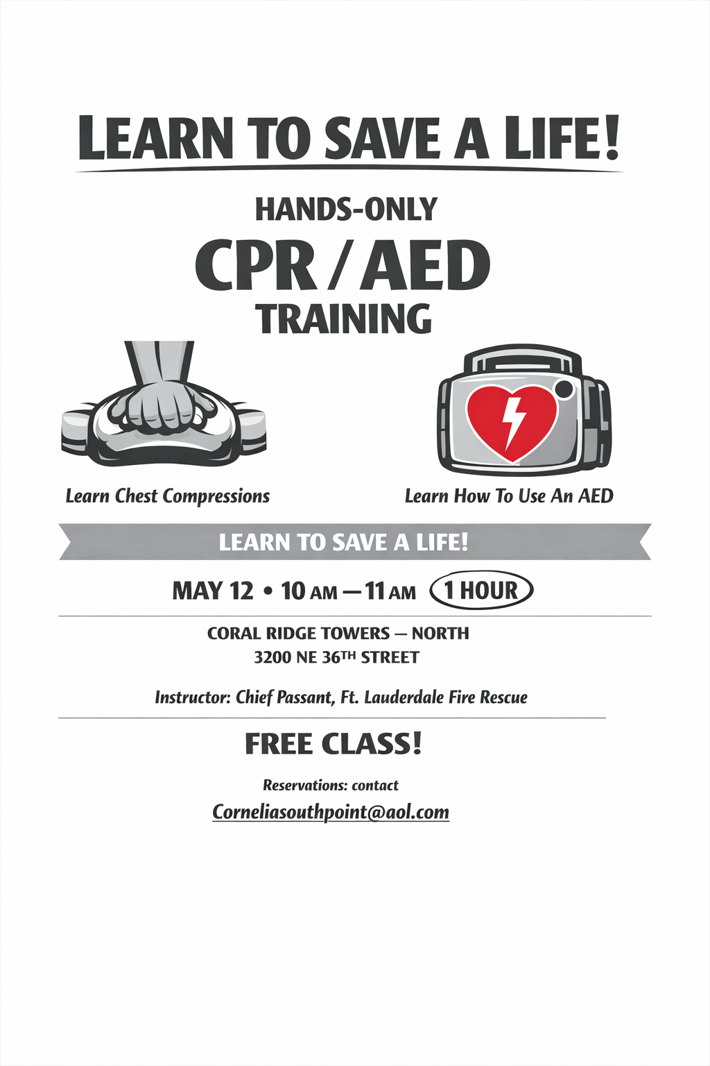 The next CPR/AED class for Galt residents and staff will be held on Tuesday, May 12 from 10-11 am at Coral Ridge Towers North. There is no cost – it’s FREE – but those planning to attend must pre-register with Cornelia at: