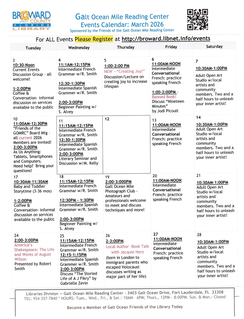 Join us at the Galt Ocean Mile Reading Center for a wonderful month of activities and events. See the calendar and pick all the ones