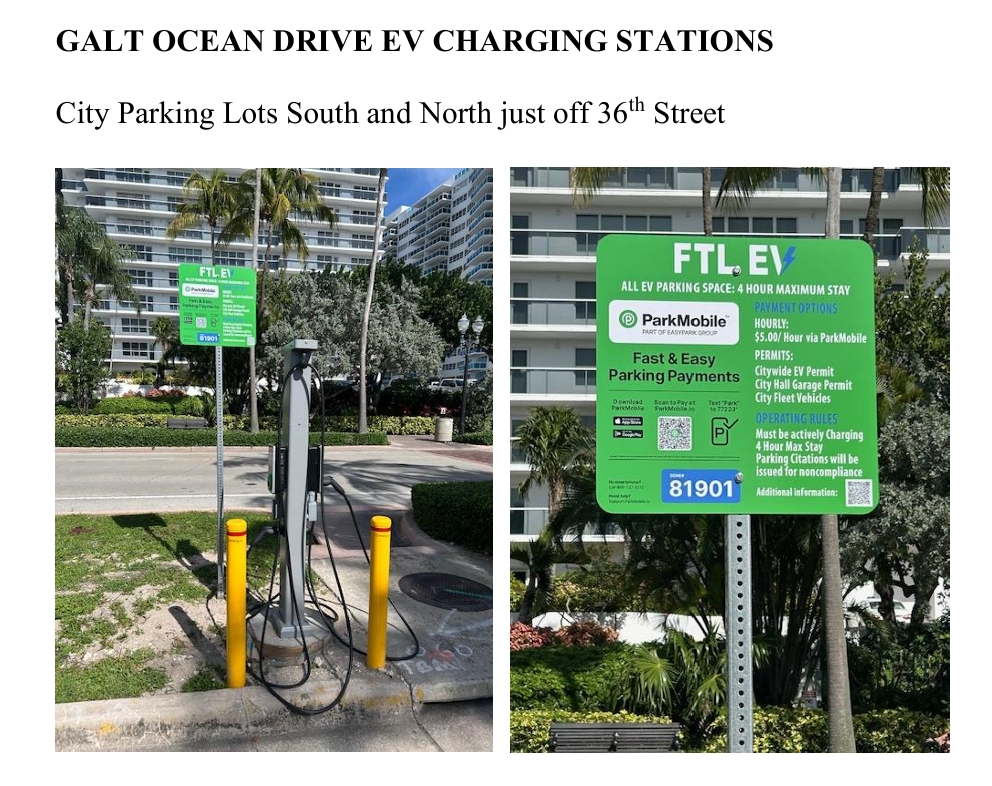 Six EV charging stations have been installed in the south and north city parking lots along Galt Ocean Drive. These new stations are pat of